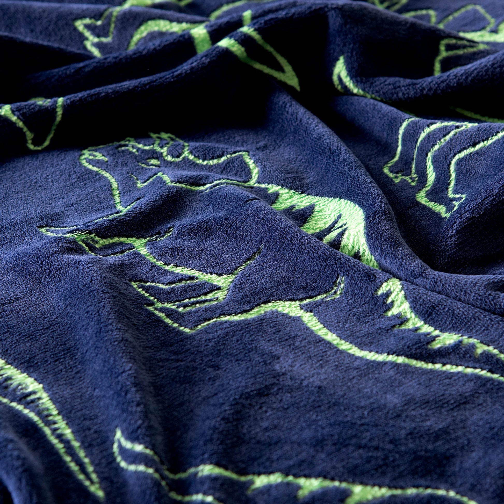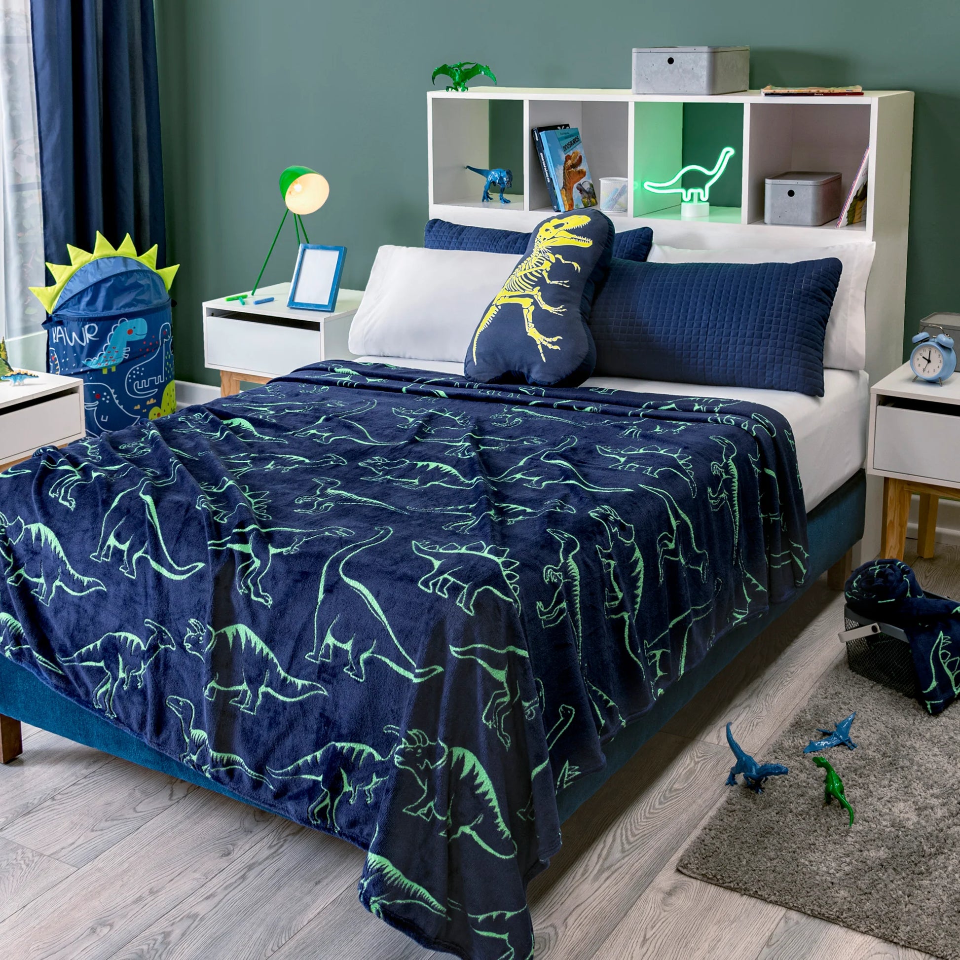 Dale a tu pequeño una habitacion llena de aventuras, le encantará el cobertor Dinosaurios en color azul y con efecto que brilla en la oscuridad, agregará más diversión a su espacio.