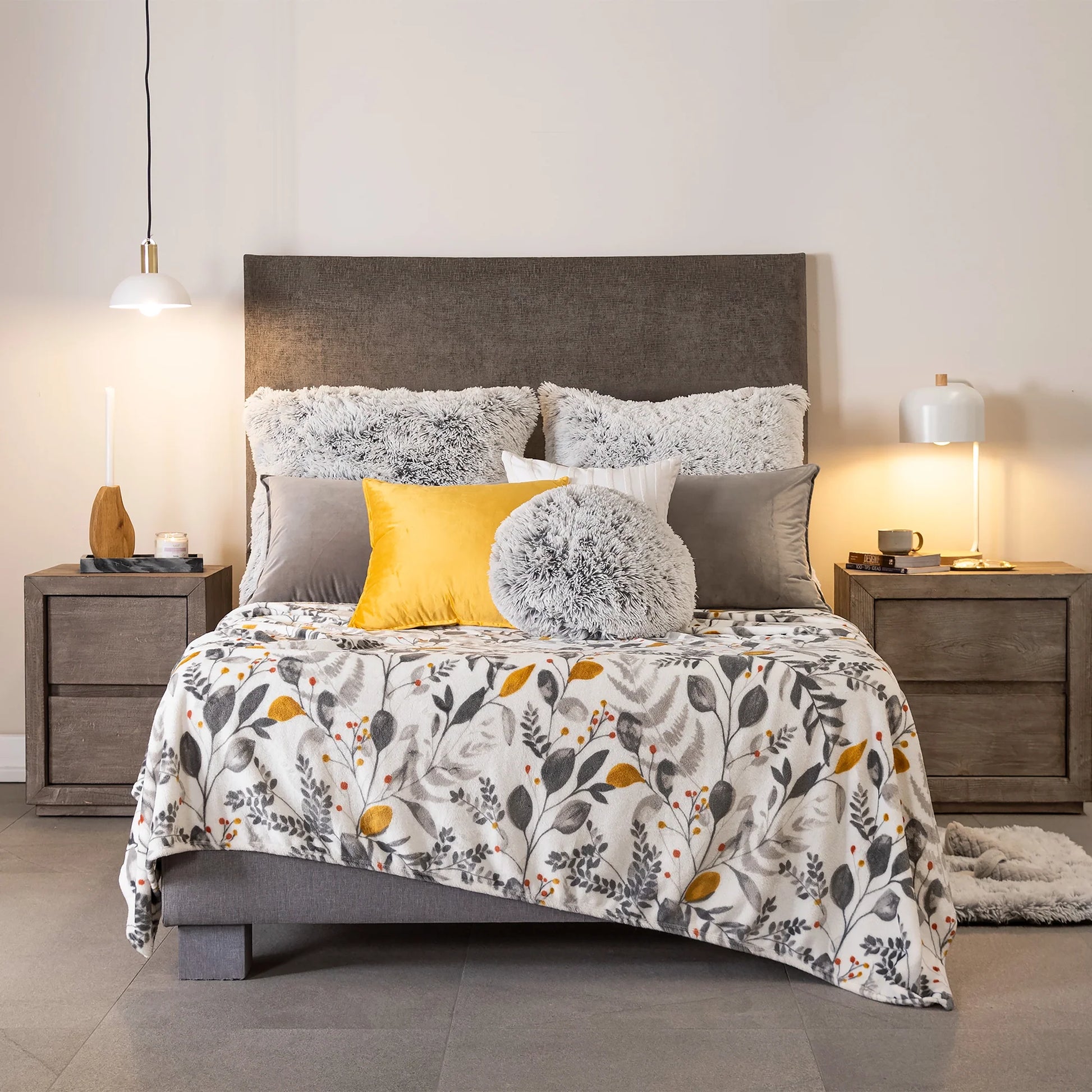 Estampado de flores en escala de grises en fondo blanco y con toques de color mostaza que llenaran tu habitación de tendencia y estilo. Es muy suave por su textura de beauty soft.