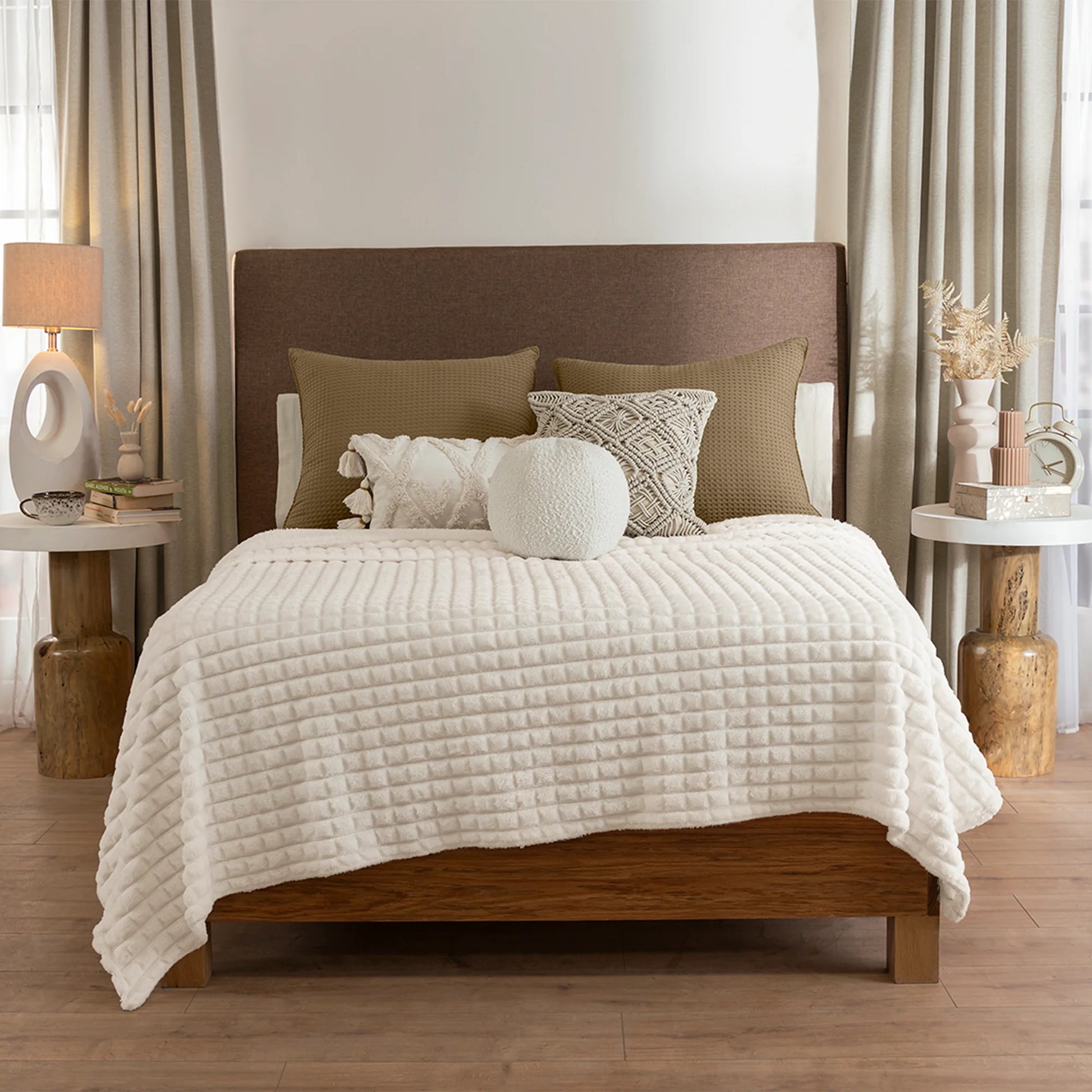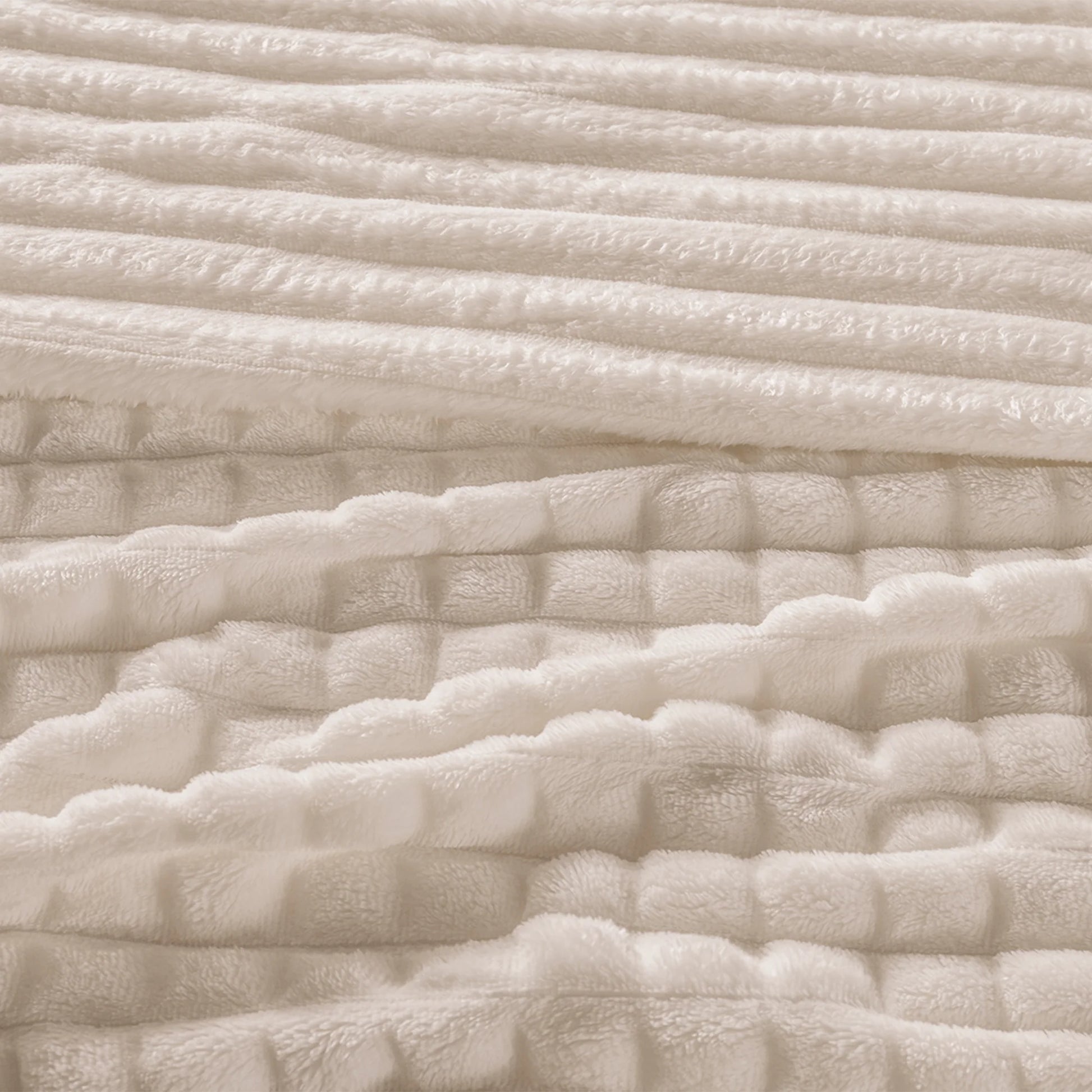 Cobertor con textura en dos vistas, la primera relieve de franjas y la segunda relieve de cuadros. Diseño versátil que no solo agrega elegancia y suavidad a cualquier espacio con su paleta neutra, sino que también proporciona variedad visual y táctil, ideal para enriquecer la decoración con un estilo discreto y refinado..