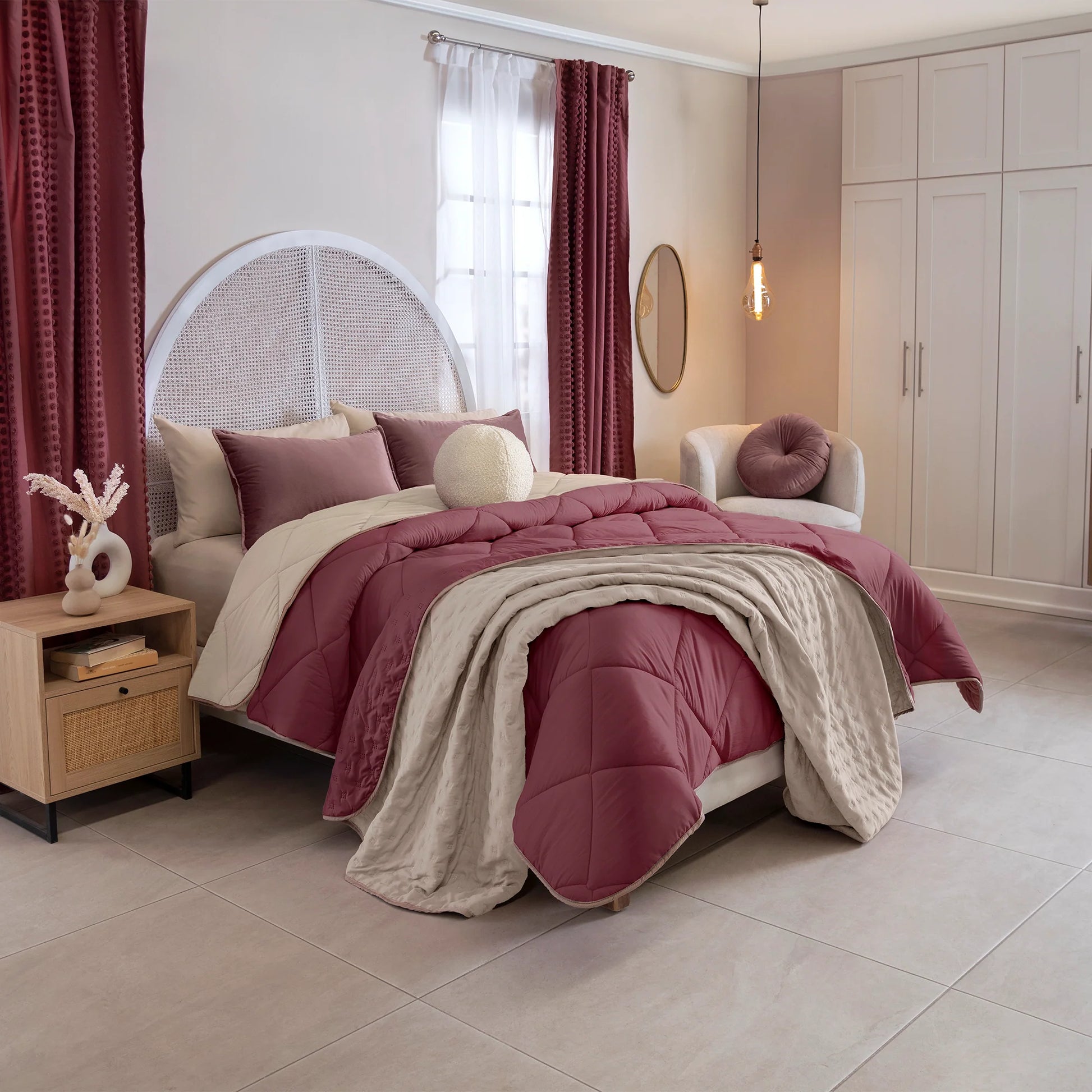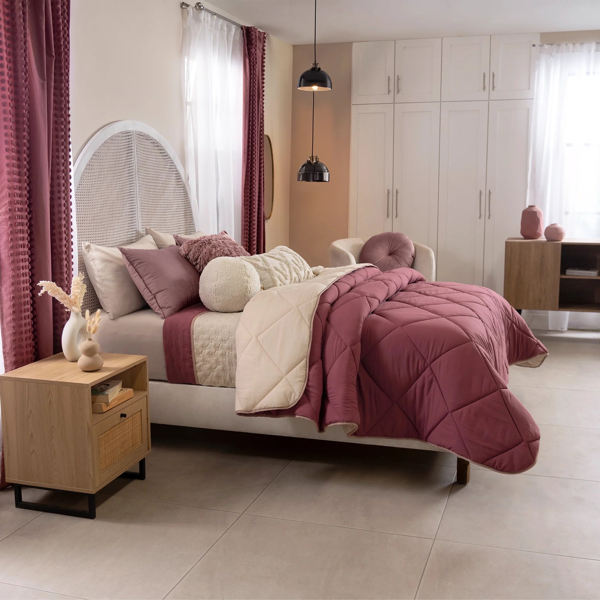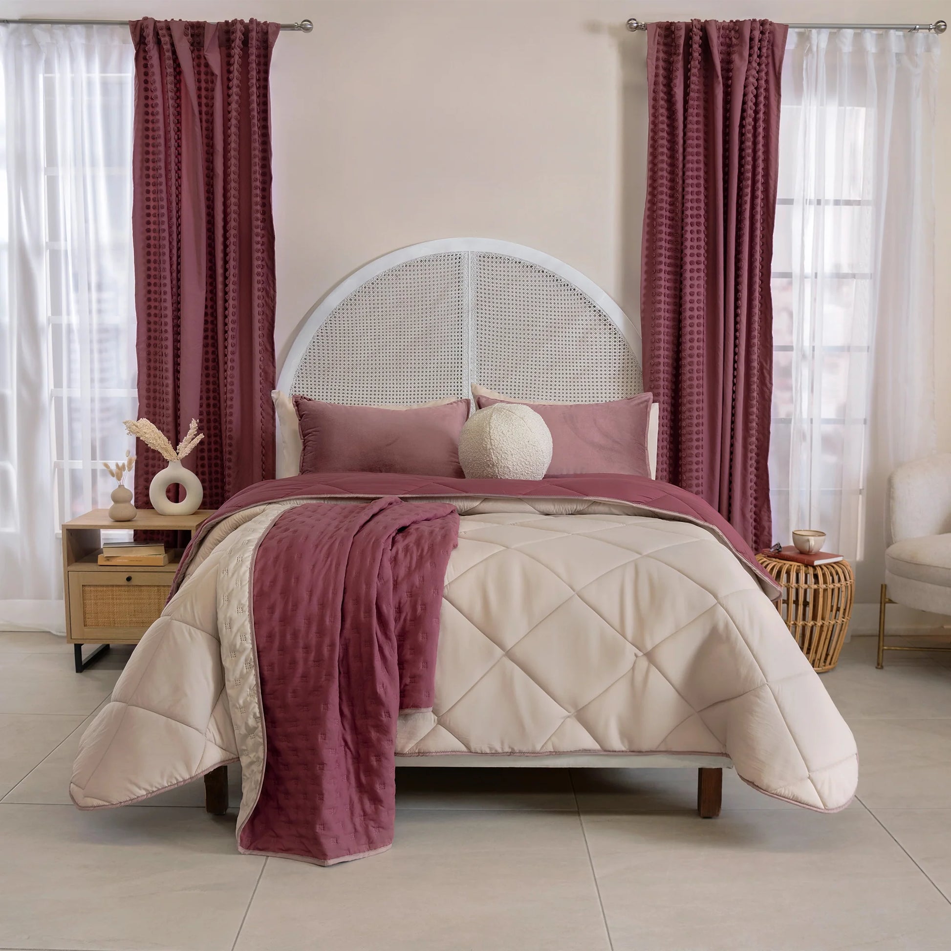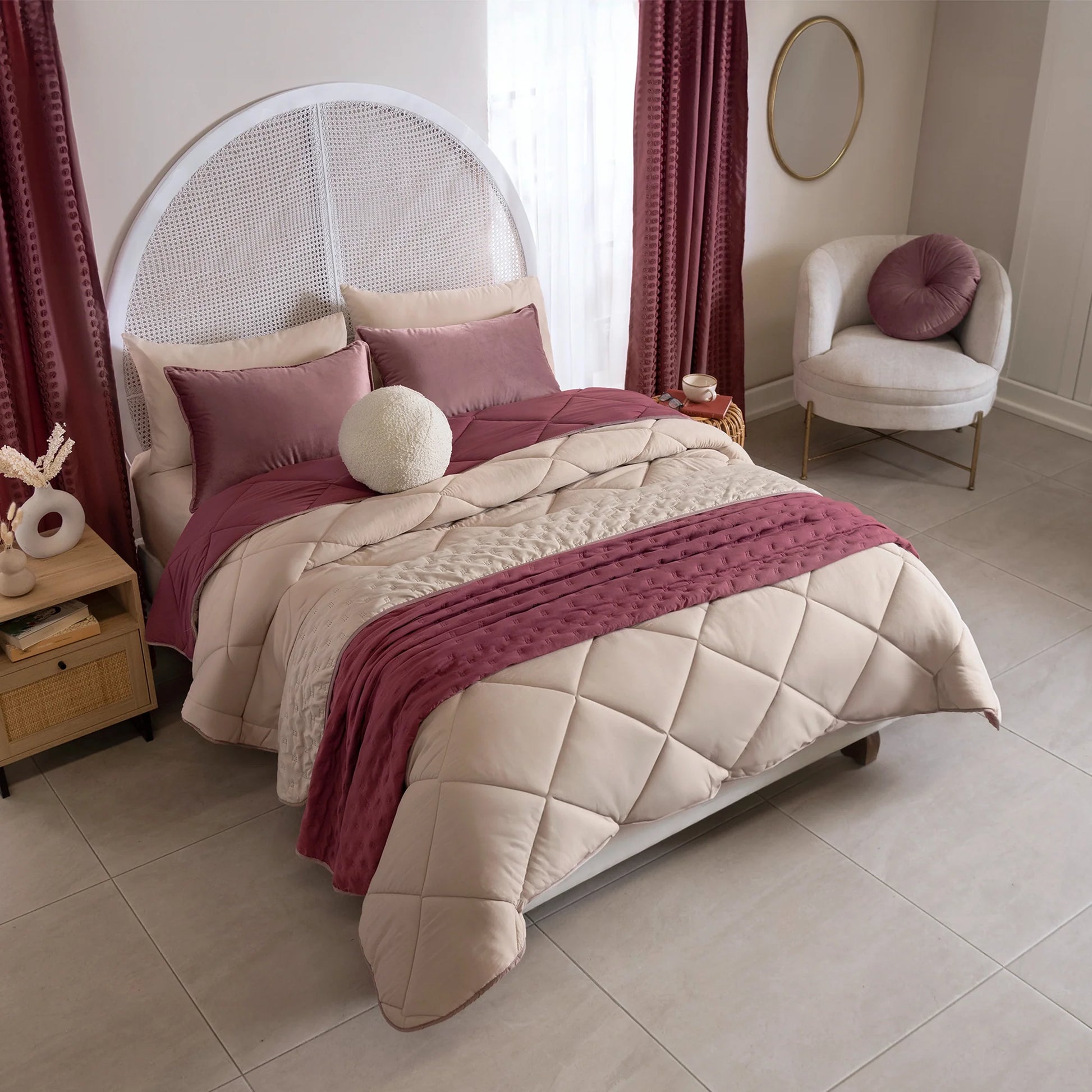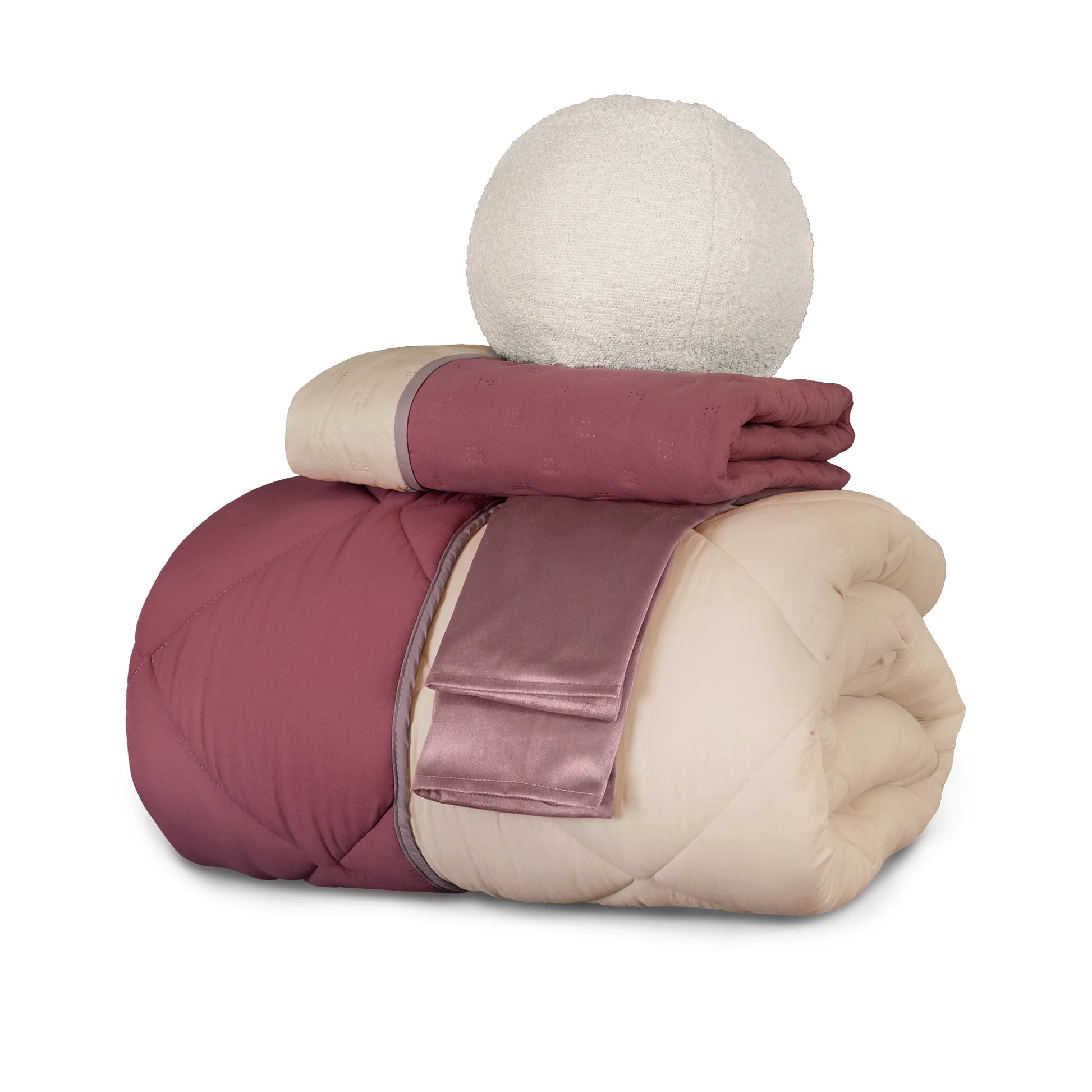 Experimenta la elegancia con nuestro edredón Girona, cuidadosamente confeccionado con una exquisita mezcla de telas y detalle de cojin de esfera. La combinación de colores beige claro y lila añade una dosis de serenidad y dulzura.