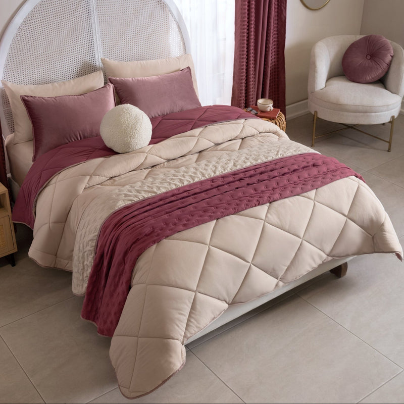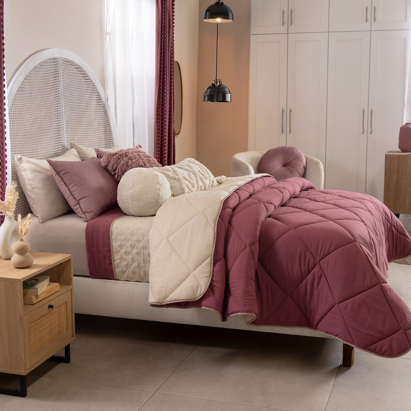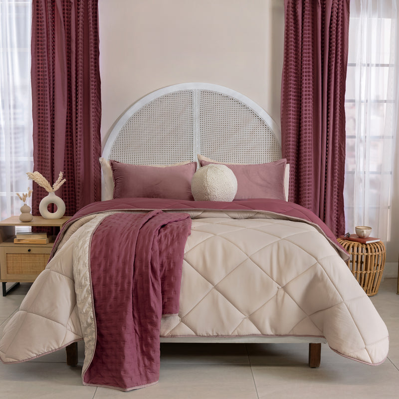 Experimenta la elegancia con nuestro edredón Girona, cuidadosamente confeccionado con una exquisita mezcla de telas y detalle de cojín de esfera. La combinación de colores beige claro y lila añade una dosis de serenidad y dulzura. Juego de edredón suave por su textura viasoft. Incluye fundas estampadas y 2 cojines decorativos.