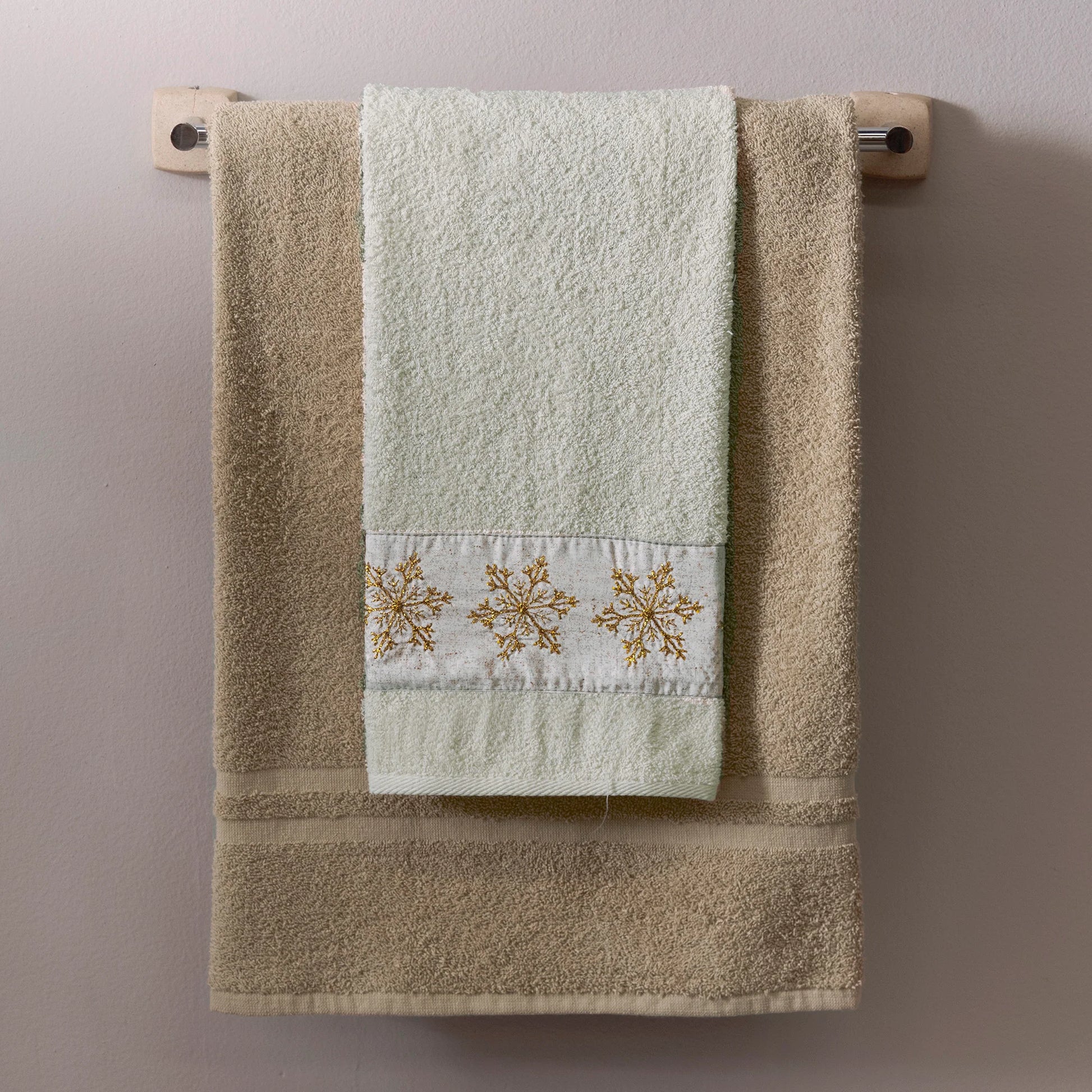 Agrega en tu decoración navideña la toalla bordada Copos, con su hilo brillante en color dorado combinable para toda la temporada.