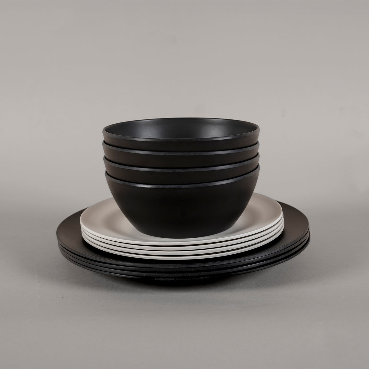 Set de 12 piezas: 4 Platos chicos, 4 Platos grandes, 4 Tazones.